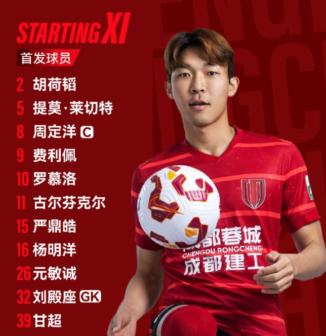 这一轮主场迎战河南队,成都蓉城在首发上派出了32-刘殿座、2-胡荷韬、5-提莫-莱切特(F)、11-古尔芬克尔(F)、26-元敏诚、8-周定洋、10-罗慕洛(F)、15-严鼎皓、16-杨明洋、39-甘超、9-费利佩(F)的阵容。主场面对无欲无求的河南队,成都蓉城开场之后控制了比赛局面,持续组织攻势冲击其后防线。第11分钟,胡荷韬单刀过掉门将后未能完成射门,错失空门良机,随后不久,胡荷韬再度破门,主裁判认定河南队球员手球在先,示意进球无效,也是引发成都蓉城教练组的抗议。 第20分钟,严鼎皓主罚任意球直接破门,帮助成都蓉城1-0先下一城。