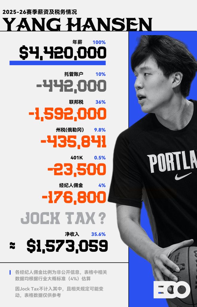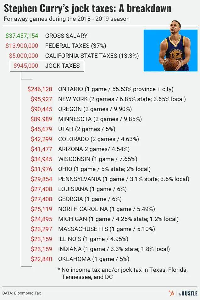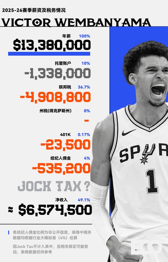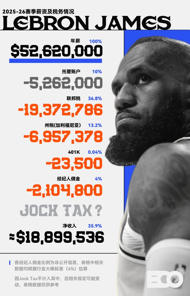 NBA级别的财富,到底是什么概念?我们先算一笔略显难过的账:根据福布斯数据,詹姆斯目前的身价约为13亿美元,也就是91亿人民币——假设你现在身价是0,或者约等于0,并从今天开始每天中一张500万元的信息,则需要连中五年(1820天),才能跟詹姆斯变得一样有钱。当然,詹姆斯的财富还在持续积累。近日,Sportico刚刚公布了本赛季NBA球员的总收入榜单,这位NBA现役中唯一的「Billionare」再次以1.326亿美元的年收入登顶榜首,其中在生涯第二十一年,仍旧拿着5260万美元的场上年薪。不过,众所周知,账面上的数字在抵达球员银行账户前,需要「过一遍水」:联邦税、州和地方税、经纪人佣金、保险与职业保障费用,联盟的托管金(ESCROW)机制等等。而美国的制度下,每个州,甚至同一个州的不同球队,税务扣除情况也会有所不同。本文,我们就来把这些数字一条条拆开,还原一下NBA球员动辄上亿的工资单上,到底有多少是真实的可支配财富。在讨论工资之前,我们必须先引入一个核心概念——篮球相关收入(BRI)。BRI是整个NBA生态里最重要的一个数字,它几乎涵盖了联盟篮球运营的全部营收:比赛日门票、本地与全国转播费用、联盟级别的品牌赞助,以及与联赛或球队相关的各类衍生授权。而之所以说他重要,则是因为工资帽的测算、每位球员的合同空间,乃至联盟与球员工会之间的收益分成,都建立在它之上。按照劳资协议的规定,BRI由球员和球队大体五五分。如果一个赛季的实际收入达到或超过赛季开始前的预测,球员端能拿到51%,球队和联盟则占49%;若低于预期,则比例反转。但问题在于:每年的BRI只有在赛季结束后才能准结算,而球员的薪资却要在赛季中照常发放。为了平衡这种时间错位,联盟设立了一个托管账户(ESCROW)机制。在发放球员的工资时,联盟会从中预扣出约10%的比例存入这个托管账户,待赛季结束后根据最终的BRI进行结算。如果球员在赛季中拿到的钱超过了他们应得的分成比例,多出的部分就从托管金中补给球队;反之,则完全返还给球员。结算完成后,联盟参照今年的数字,计算出下一年的BRI,扣除预计的保险和福利支出,从而推算出下一年的工资帽(Salary Cap),从而在30个大小不同的球市,以及30个身价不等的老板之间,维持住竞技体育的公平。各队总经理会根据球队发展路线规划对于工资帽的使用图源:Yahoo以刚刚过去的2024-25赛季为例:去年赛季开始前,BRI被预估为102.5亿美元,按上文比例分成,并扣除约7亿的保险部分后,平均分到30支球队,就得出了去年的工资帽:1.405亿美元。而因为劳资协议规定,每年的工资帽涨幅不能超过10%。因此,即便760亿的天价转播合同开始生效,BRI大幅上涨,今年的工资帽也只是上涨了10%,来到1.546亿美元。对球员而言,工资帽决定了最多能拿到多少钱,但真正能装进口袋的收入,却远没有账面数字那么简单。当工资从联盟拨付到个人账户的那一刻起,一整套复杂的财富分配体系也随之启动,而其中的第一道,也是最大一道切口,来自税。美国的联邦个人所得税实行累进制征收。简单来说,收入越高的部分,税率越高,但不是全部收入都按最高税率算,而是分段征税。根据美国国税局数据,2025税年中,单身申报者税率从10%起步,最高达37%。对于像NBA球员这样的高收入群体来说,他们的大部分收入会被划入37%这一档。以杨瀚森为例——他在2025-26赛季的年薪为442万美元(约3100万人民币),仅联邦税一项,就要缴纳约159.2万美元,占总薪资的36%。但联邦税只是第一刀。在美国,每个州政府拥有独立征税权和税务政策,这意味着同样的一份合同,在不同州,甚至同一个州的不同球队里,含金量都完全不一样。加州的收入税最高能达到13.3%,为全美最高,湖人和勇士仅在球员工资这一项,每年就要向州政府交出千万级别的税额,而在亚利桑那(太阳)或印第安纳(步行者)这样的低税州,这个数字会骤降至2.5%上下。同时,佛罗里达、得克萨斯、华盛顿特区、田纳西、怀俄明、内华达、新罕布什尔、南达科他、阿拉斯加这九个州则完全免征州收入税。因此,在迈阿密和洛杉矶拿同样的年薪,税收扣掉的部分相差能够达到几百甚至上千万,这也是为什么有的球员在签约时,不光看球队,也看邮编。值得一提的是,这些没有收入税的州或地区,往往有更高的销售税、房产税和遗产税,以平衡城市财政收入,得克萨斯州便长期位列全美房产税负担最重的地区之列。事实上,许多在高税州打球的球员会借助专业的报税机构,做合规的税务优化。据美国知名会计顾问企业PKF O'Conner Davies合伙人约瑟夫·多伦介绍,许多球员会选择通过居住地申报、信托架构,以及延后发放等方式,以平滑年度税负。问题来了,对于NBA球员来说,一年中有一半的时间都在客场作战,其中的许多经济效益并非来自已经交过税的母队所在地,那这个税怎么算?1991年,公牛队在洛杉矶客场赢下总冠军后,加州税务局便提出了这样的疑问。相关人员当时认为公牛队在加州土地上为自己创造了巨大财富,但并没有向加州上缴任何税款,随即决定向迈克尔·乔丹与整个公牛队加征州税。作为回击,公牛队所在的伊利诺伊州举一反三,宣布对所有来芝加哥打客场的球员征收州税,后来几年,各州纷纷效仿,最终形成了美国境内为体育、演艺行业量身定制的「Jock Tax」。简单来说,每到一座不同的城市打客场,球员都就会被记上一笔「Jock Tax」,这意味着NBA球员