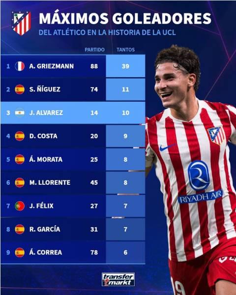 根据统计, 阿尔瓦雷斯已经代表马竞在欧冠中打进了10粒进球,位列队史欧冠进球榜第三名。马竞队史欧冠进球榜:1、格列兹曼 88场39球2、萨乌尔 74场11球3、阿尔瓦雷斯 14场10球4、迭戈-科斯塔 20场9球5、莫拉塔 25场8球5、马科斯-略伦特 45场8球7、菲利克斯 27场7球7、劳尔-加西亚 31场7球9、安赫尔-科雷亚 78场6球