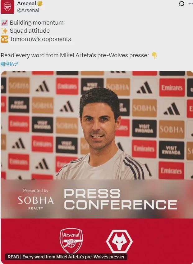 官方:阿森纳宣布足总杯第三轮对朴茨茅斯的比赛被安排在了2026年1月11日周日下午2点(当地时间)进行,枪手将客场作战。阿森纳官方同时指出,和往年不同,今年如果比赛以平局结束并不会重赛,而是直接进入加时赛甚至点球大战。就足总杯来说,这个时间算是相当友好了,不是晚场。另外,不重赛绝对是好事,就目前的比赛数量来讲,早就饱和了,这不仅仅对阿森纳是好事,对所有豪门来说都是好事,重赛1场比输球还难受……到时候直接拿下就是了!官方:阿森纳宣布和Deel建立长期合作伙伴关系,这家全球领先的薪资支付和人力资源平台将成为俱乐部官方人力资源平台合作伙伴。而Deel的品牌将出现在酋长球场的各个位置以及数字渠道上,包括英超联赛、女子超级联赛、足总杯和联赛杯的所有主场比赛中。Deel现在为全球37000多家企业和150万名员工提供帮助和支持,2025年10月,该公司宣布了E轮融资,估值达到173亿美元。TA也报道了这次合作,咱们看完一起说吧。根据TA记者DO和gunnerblog的综合消息,阿森纳的新赞助商Deel将从下赛季开始取代“参观卢旺达”,作为球队的新袖管赞助商。好,简单说说。首先,目前的消息是,Deel会取代参观卢旺达,成为下赛季阿森纳的袖管赞助商,这一点其实是阿森纳官网并没有明确点出的,官方明确点出的是,“Deel的品牌将出现在酋长球场的各个位置以及数字渠道上,包括英超联赛、女子超级联赛、足总杯和联赛杯的所有主场比赛中”。也就是说,与Deel的合作其实很广泛,既有球场内品牌标志的展示,又是袖管赞助,而不仅仅是袖管赞助商。至于合作年限,官方没有说明,但强调是“建立多年合作关系”。赞助金额也不清楚,不过参观卢旺达是每年1000万英镑左右,预计这个应该也差不多。另外说起这个Deel,还有一点不得不提,这是一家中国人创办的公司!而且还是个从东北出生长大的90后女生,王硕(后考入麻省理工学院读书)!她是2019年创立了Deel,现在已经发展成世界级独角兽公司,太强了。据说这次合作还是大卫-邓恩的儿子达伦-邓恩牵线达成的。阿尔特塔出席了赛前新闻发布会,我们来看主要内容。萨利巴的情况有什么新进展?我们必须等等看,昨天(周四)我们没有训练,萨利巴也还没跟我们训练。所以我们还有一天时间,让我们看看萨利巴是否能出场吧。之前5次新闻发布会你都说萨利巴需要几天时间,所以现在他还是需要几天时间吗?情况还是一样,是的。如果你们问我萨利巴能否赶上对埃弗顿的比赛,我会说他应该可以,但你如果问我明天这场比赛,那我不知道。廷贝尔目前什么情况?他之前被踢了一下,感觉不适,所以我认为还是需要几天。但明天是否能出战,咱们等等看。那赖斯情况如何了?让我们看看他今天的情况再说,他是生病,通常来说生病的话几天内就能恢复,但我们必须等等看赖斯能争取到什么程度。特罗萨德的情况呢?也一样,另一名需要几天时间的球员。听起来可能很无聊,但这就是现实,我们也不知道他能否出战。狼队本赛季相当糟糕,最近8场比赛全输,而且英超至今未尝一胜,你们明天预计会拿下3分,但球迷甚至球员是否有掉以轻心的危险?任何英超比赛,尤其是对阵一支为了扭转局面而战的球队时都不能掉以轻心。我很了解他们的主帅,他会努力让自己的球员们做好准备。所以我们会从一开始就全力以赴,因为我们知道自己必须怎么做。热苏斯周三复出了,你是否看到他再次为首发中锋的位置而战?你如何看待他的角色变化?是的,他这样水平的球员,并且为我们做出了那么多贡献……那天他上场之后活力十足,热苏斯当然必须努力以此为目标。你是否认为阿森纳得到了足够的赞美?你们打进了很多定位球,最近又打进了很多运动战进球,但我认为阿森纳并没有得到应有的赞美,无论是表现还是这支球队的实力:我不知道,这不由我来评判的。在本赛季参与的3项赛事里,我们都很强势,这是我们必须继续保持的。赞美应该来自赛季结束后,因为那才是我们评价自身表现的时候,但为了实现这点,你就必须实现每天的目标,目前为止我认为我们的处境真的非常好。萨利巴究竟遇到了什么问题?是很小的问题,是之前就遇到的脚踝伤势,萨利巴因此调整了自己的跑步方式,然后导致一个区域压力超载,这很正常。不过在某个节点,这种不适导致萨利巴无法再参加训练或比赛,因此我们不得不让他停下。萨利巴看起来好多了,但我们必须等等看他是否可以归队训练。热苏斯的合同还剩一年半,你已经拥有哲凯赖什、哈弗茨和梅里诺,所以你会考虑出售热苏斯吗?不,我没有考虑这点,尤其是目前这种情况下。我认为热苏斯还有很多可以为球队贡献的地方,并且他在上场之后不久就证明了这点。热苏斯现在专注的就是和球队一起前进。以上是新闻发布会的大部分内容。伤病方面,其实没啥好说的,典型的阿尔特塔式回答,“看看再说”。不过萨利巴应该是快复出了,阿尔特塔说他能参加对埃弗顿的比赛,说明很接近复出了。对狼队的比赛,没有萨利巴也应该拿下,就让他再休息几天吧。而且听阿尔特塔的解释,似乎是萨利巴受到旧伤影响,长期迁就受伤部位,导致其他部位受力过度,这种还是休息好吧,否则很容易成为长期慢性病。特罗萨德、廷贝尔和赖斯都不是大事,随时可能复出。至于阿森纳没有得到足够的赞美,我认为不是因为没有结果,阿尔特塔说赛季结束后才会